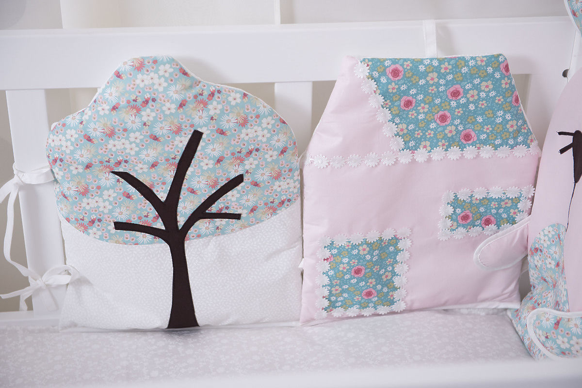 Stylové mantinely do postýlky v několika vzorech zaujmou na první pohled. Každá jednotlivá část mantinelu má čtyři šňůrky, kterými se na postýlku snadno připevní. Každý z mantinelů je ručně šitý ekologický produkt ze 100% bavlny.