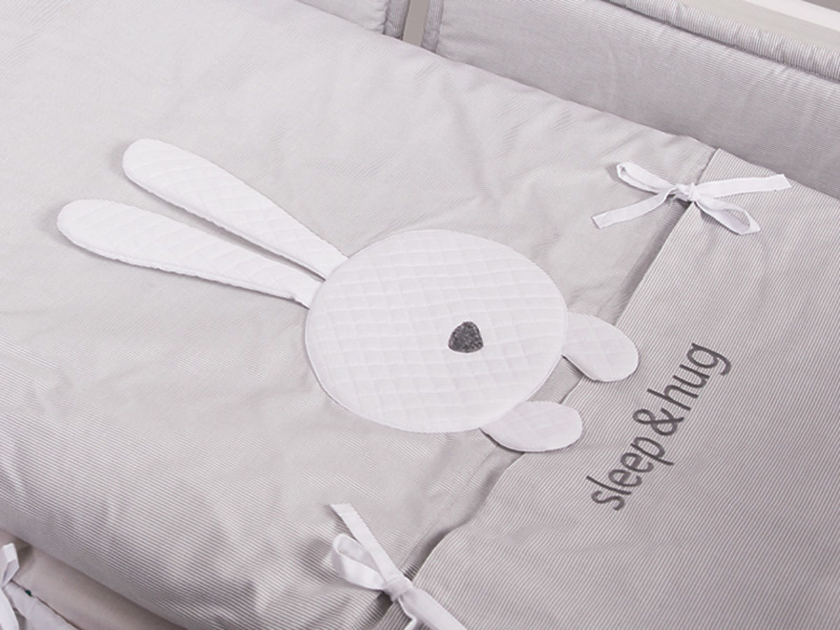Roztomilá kolekce s krásným zajíčkem, který bude kontrolovat všechny miminka při jejich spánku. Děti si toto povlečení zamilují, odstávající měkoučké uši budou jejich oblíbenou hračkou v postýlce. Měkoučký, šedý nosík ozdobí jemné barvy povlečení. Mašličky v polovině povlečení nejsou jen jemnou dekoraci, ale také praktické. Výplň se vkládá uprostřed, zabraňuje tak vypadávání peřinky.