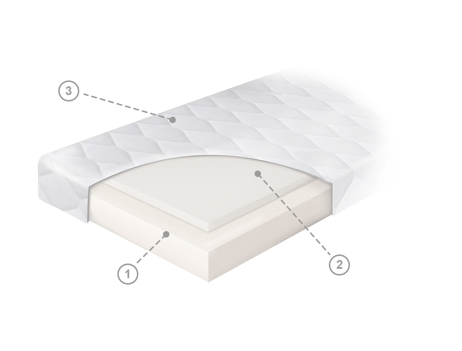 Složení matrace: (1) Jádro matrace z PUR pěny (2) VISCO pěna (3) Antialergický potah