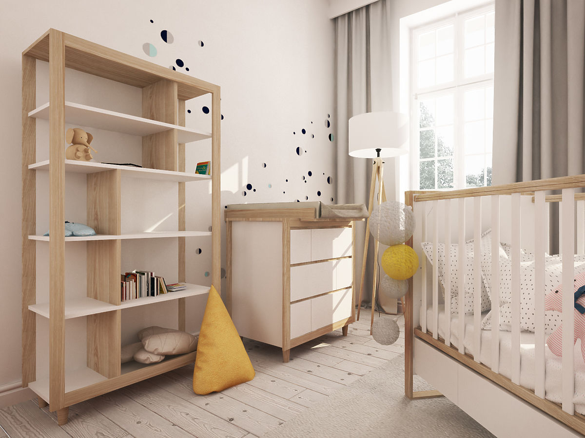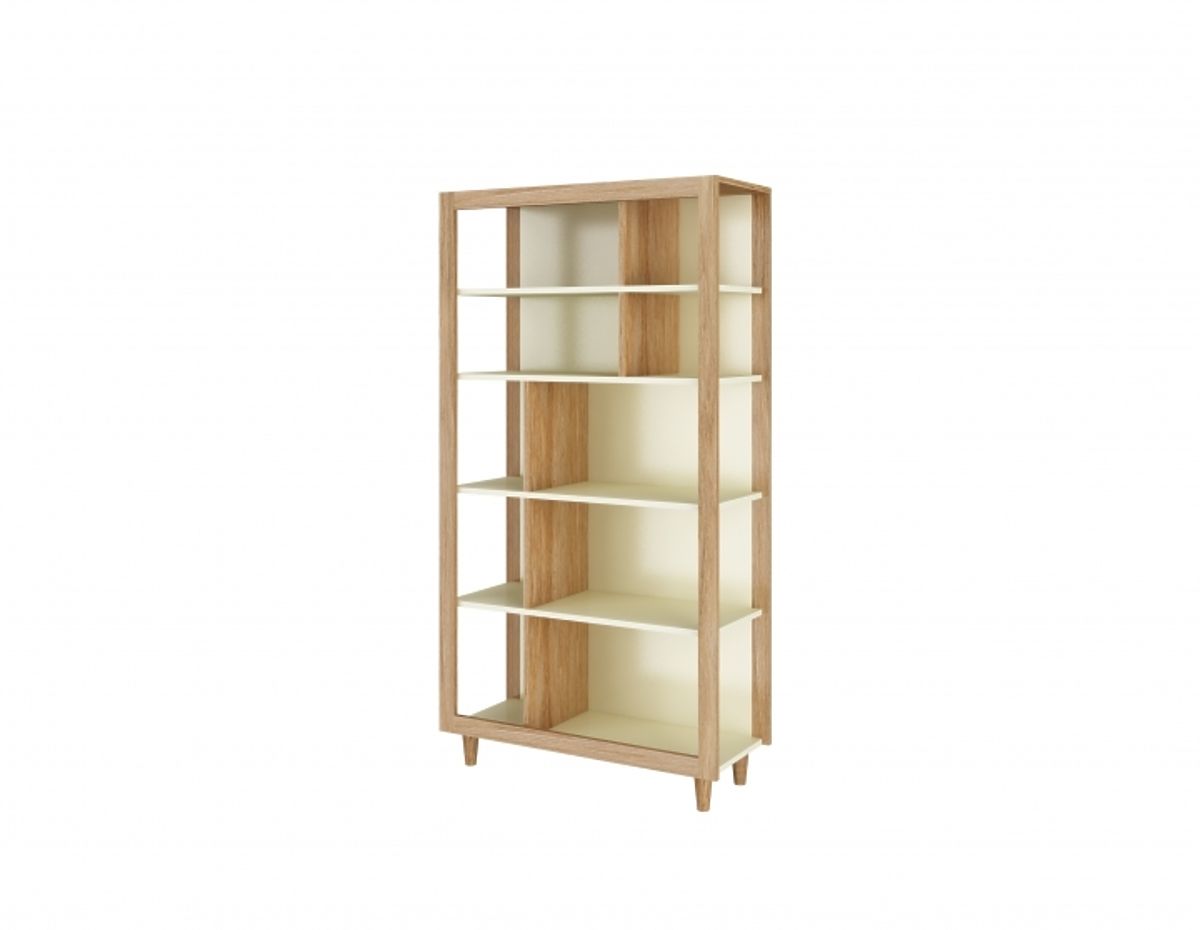 Regál má v dětském pokoji široké uplatnění, od přehledného uložení věcí po úsporu prostoru v místnosti. Dvoubarevná kombinace jemné krémové barvy a dubu působí velmi příjemně a vnáší do pokoje eleganci a styl.