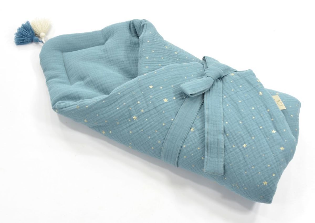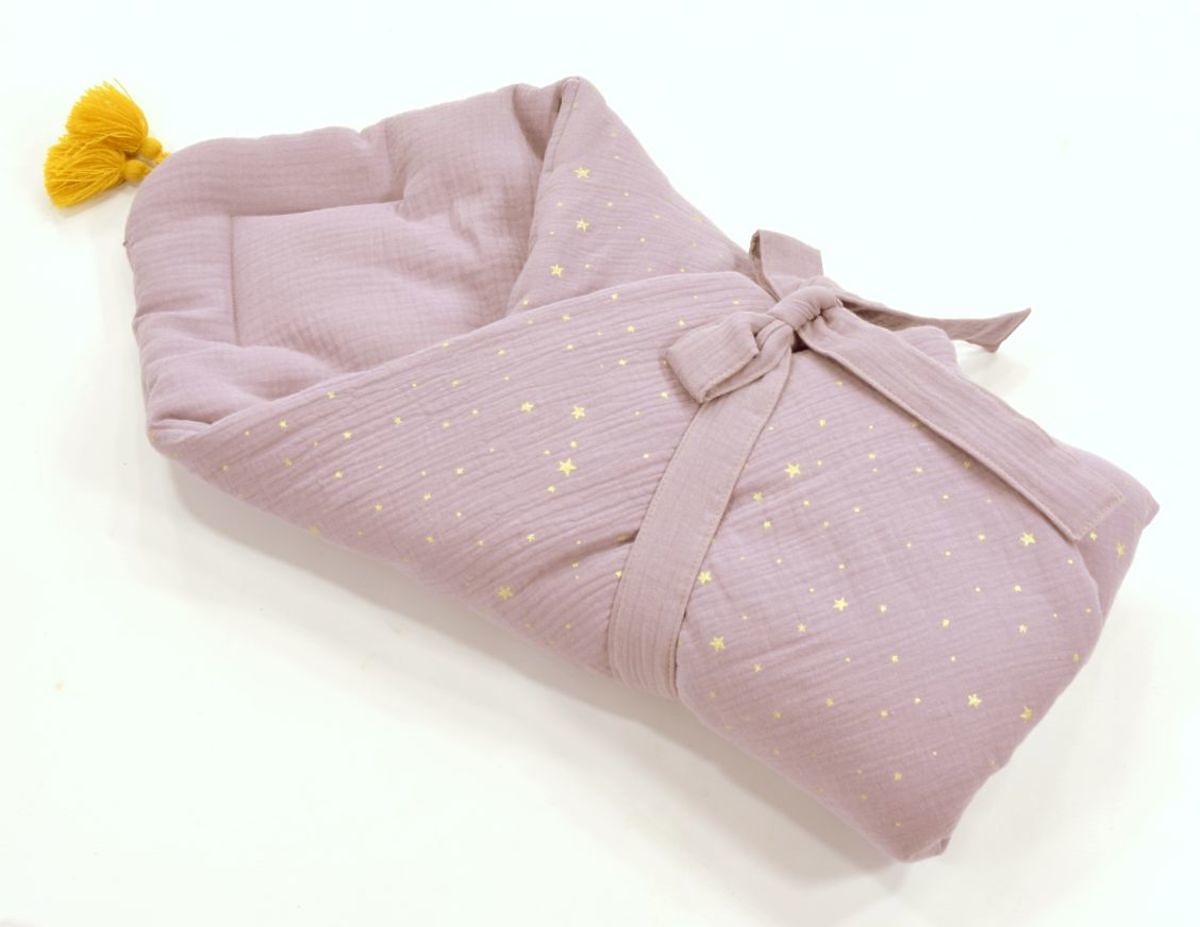 Luxusní zavinovačka z mušelínové bavlny s potiskem drobných zlatých hvězdiček.