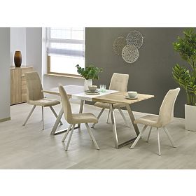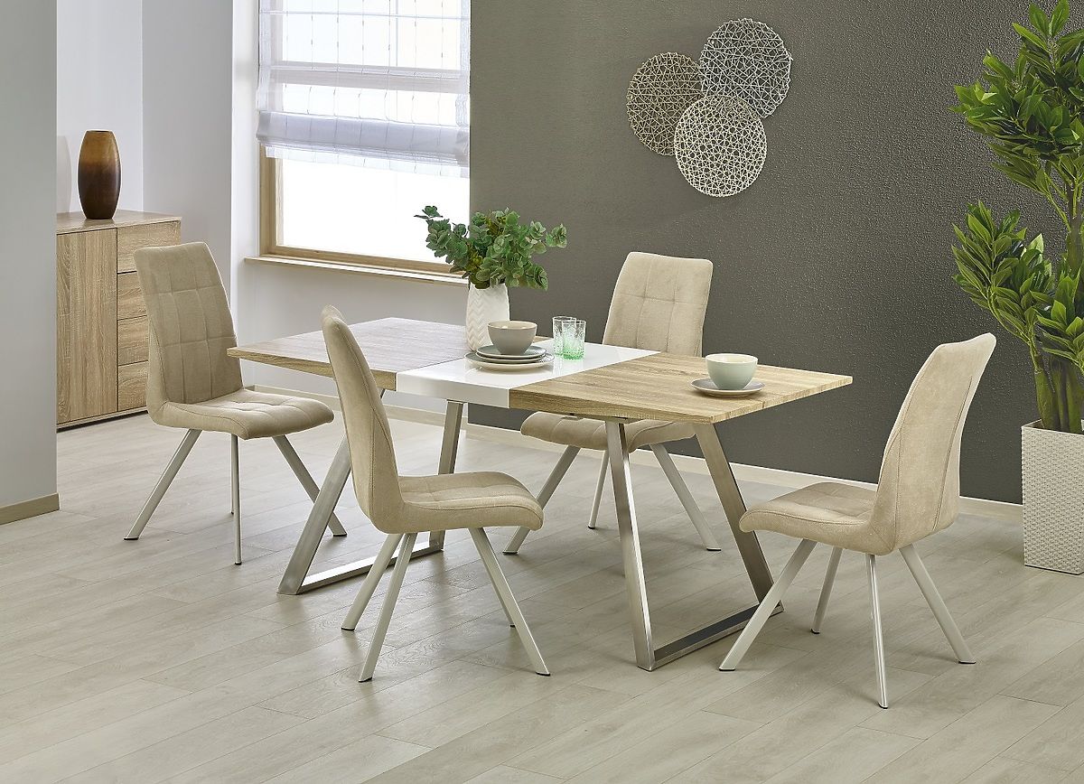 Jídelní stůl vás zaujme svým elegantním a zajímavým designem. Deska stolu je z lakované a laminované MDF desky. Konstrukce je z nerezové ocele.