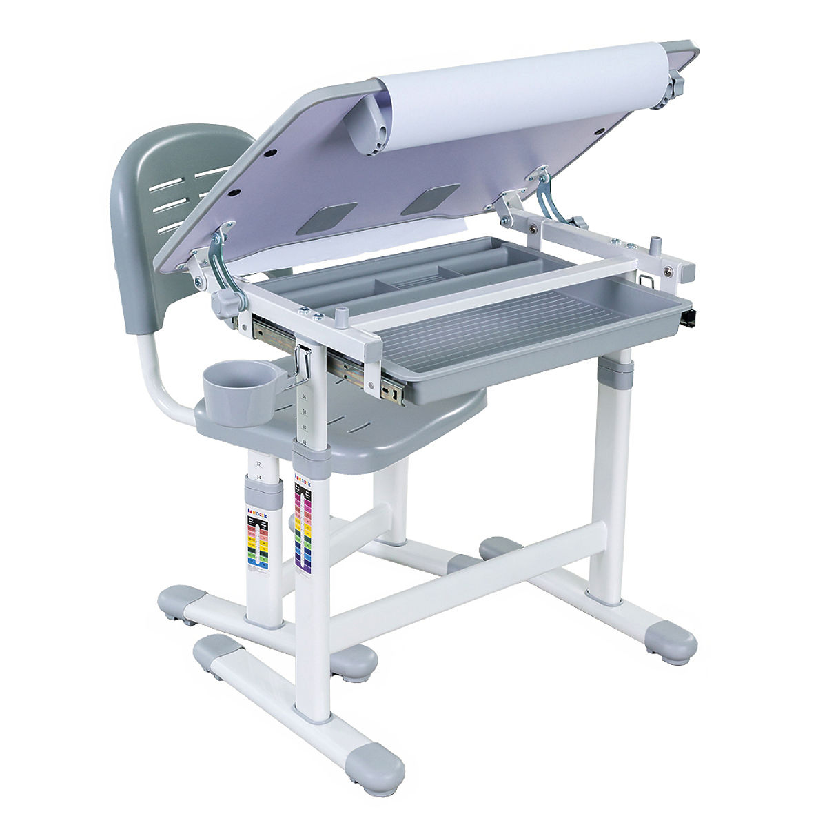 Správné sezení je základem zdraví každého dítěte. Při psaní úkolů, nebo kreslení musí děti nejen správně sedět, ale také potřebují ideální výšku a sklon psacího stolu. Židle i stůl mají regulaci výšky, porostou tak spolu s dítětem. Psací plochu je možné naklonit do 40°. Stůl také obsahuje praktický šuplík na sešity, psací potřeby, nebo knihy.
