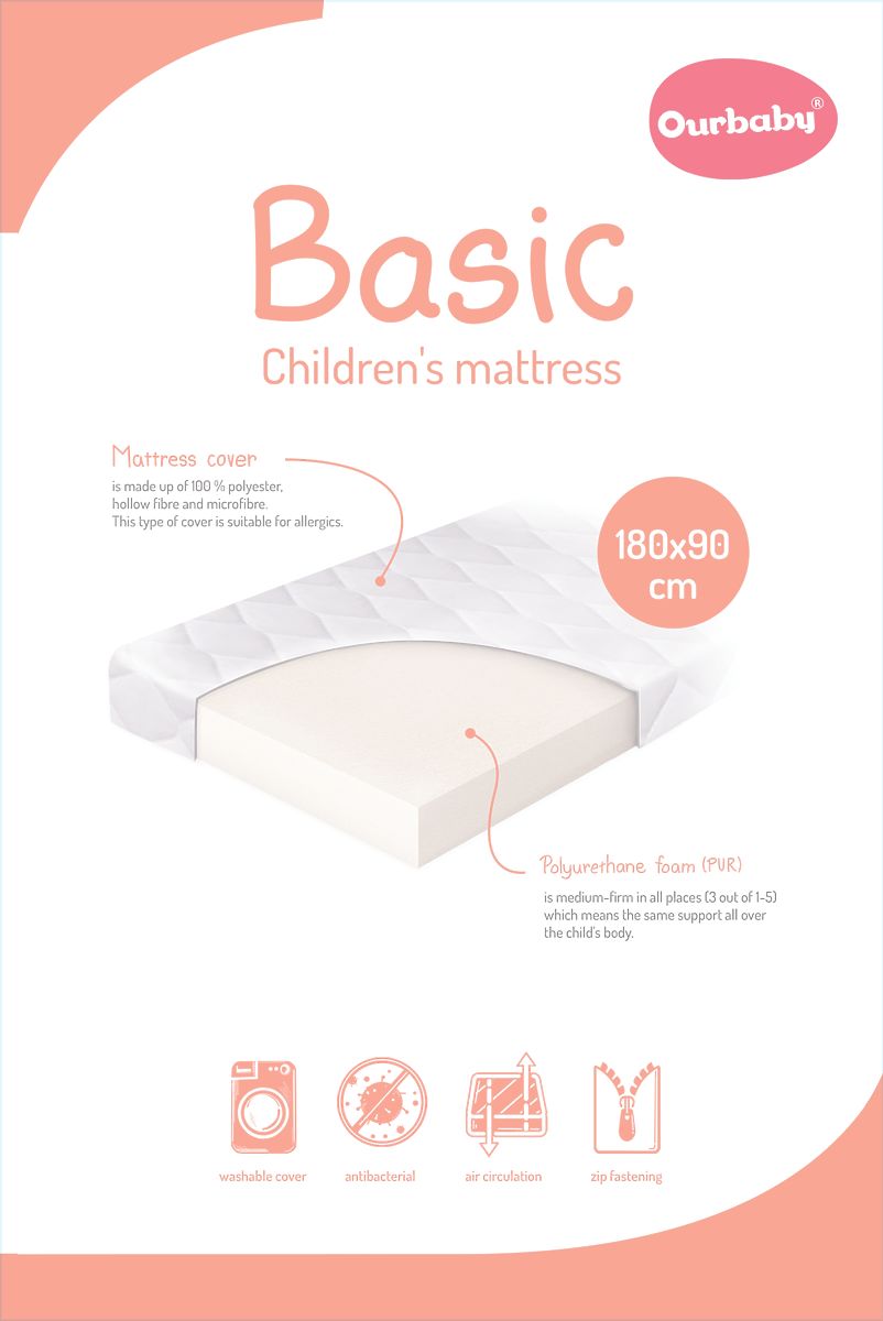 Řada BASIC - Základní řada matrací naší značky Ourbaby®, pod kterou produkujeme nejen matrace. Pěnové matrace BASIC nabízíme v rozměrech pro děti každého věku. PUR pěna matrace je středně tuhá. Dětské matrace BASIC jsou nejlepší volbou pokud sháníte kvalitní matraci za přijatelnou cenu.