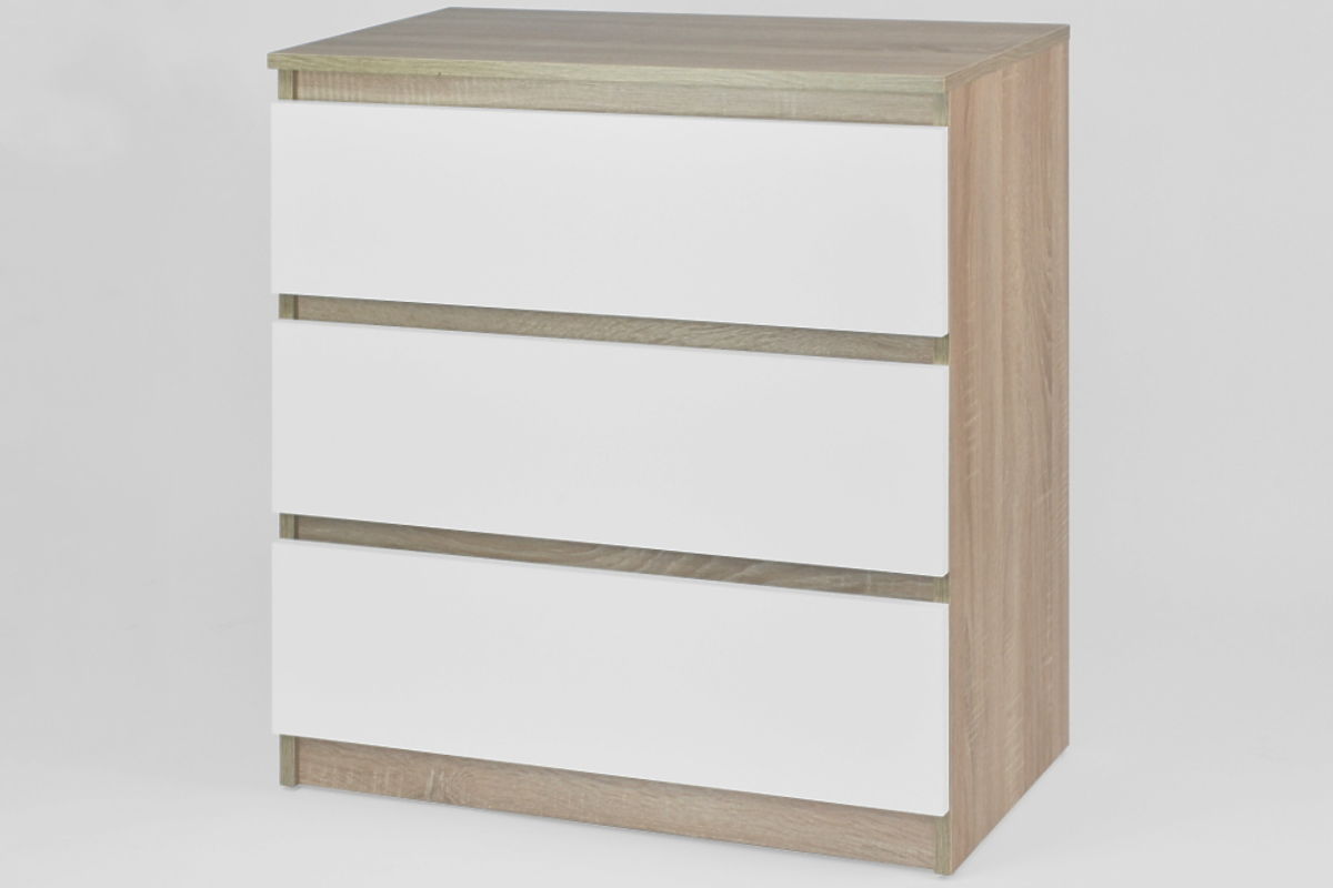 Přebalovací komoda v provedení dub sonoma v kombinací s bílou barvou, se třemi zásuvkami a přebalovací plochou. Vrchní přebalovací desku lze snadno demontovat a použít komodu i v pokoji školáka.