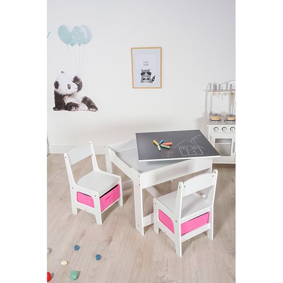 Krásný stoleček se židlemi najde uplatněni v každém dětském pokojíčku. Nabízí variabilní desku stolu, která se může proměnit na černou křídovou tabuli. Praktické boxy v růžové barvě poskytnou úložný prostor navíc.
