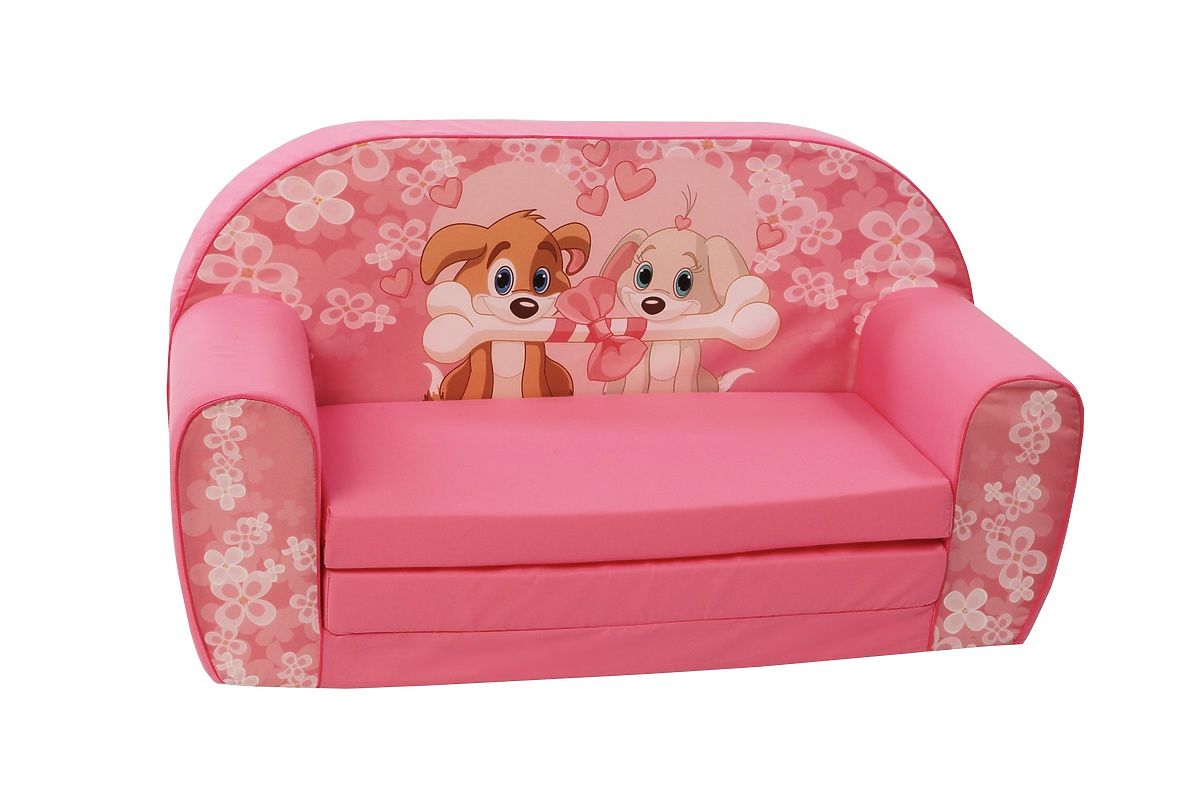 Krásná růžová pohovka s roztomilými pejsky je lehká, takže ji i dítě může snadno přemístit, rozložit i složit.