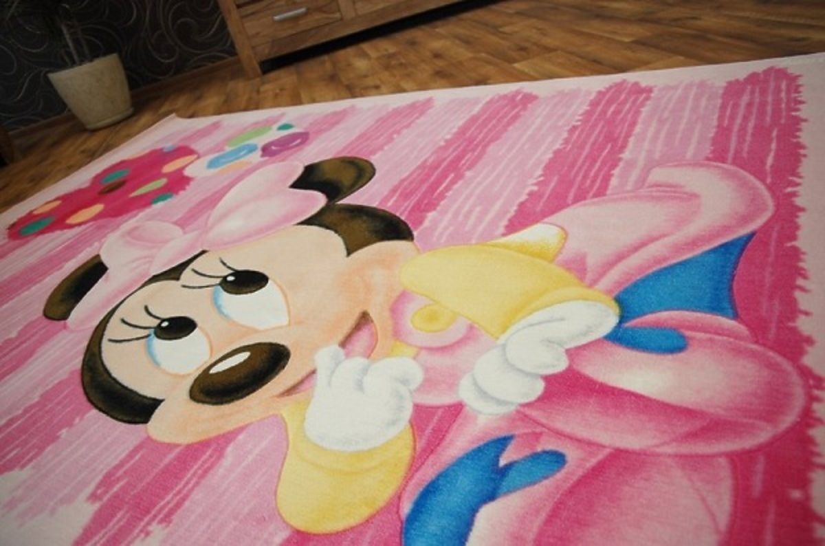 Dětský koberec Baby Minie 309. Krásný růžový kobereček do pokojíčku Disney s motivem malé Minie. Kobereček má originál licenci Disney a je nádherně pestrobarevný, heboučký a hustý. Hustota stř. vlasu 114.000 pkt./m2 hmotnost 2,40 kg/m2, složení 100% akryl.(termoplastický)