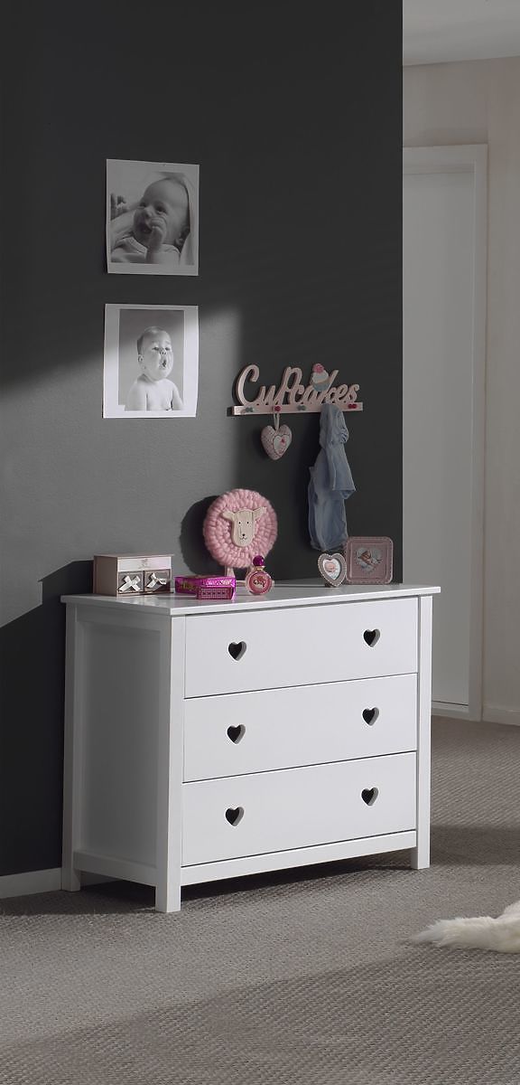 Krásná komoda Amori v bílém provedení, vyrobená v Belgii, pro kterou jsou charakteristické čisté elegantní linie s krásným detailem vyřezaných srdíček.