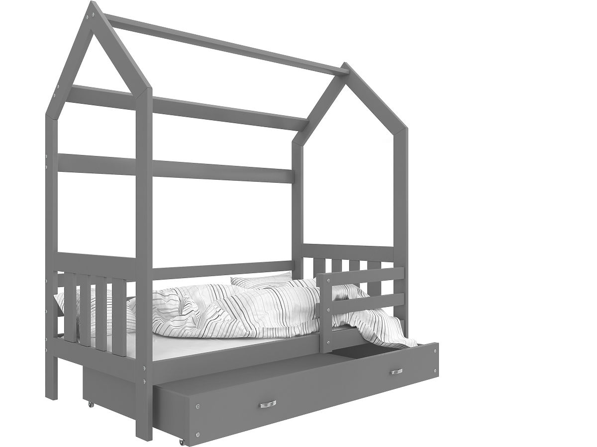 Šedá postel ve tvaru domečku nabízí nejen originální místo na spaní do dětského pokoje, ale je také velmi praktická a to díky prostornému úložnému prostoru.