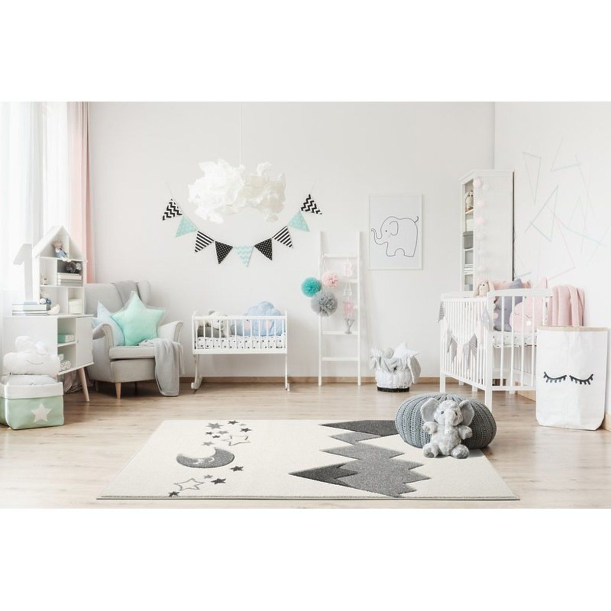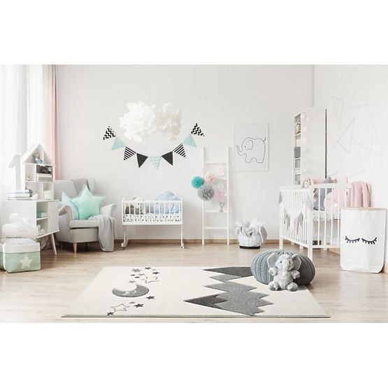 Luxusní krémový koberec s motivem hor, měsícem a hvězdičkami v šedé barvě od německé společnosti LIVONE si zamiluje každý člen rodiny.