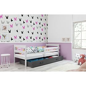 Jednoduchá bílo-šedá postel Erik do dětského pokoje s šuplíkem a bezpečnostní zábranou.