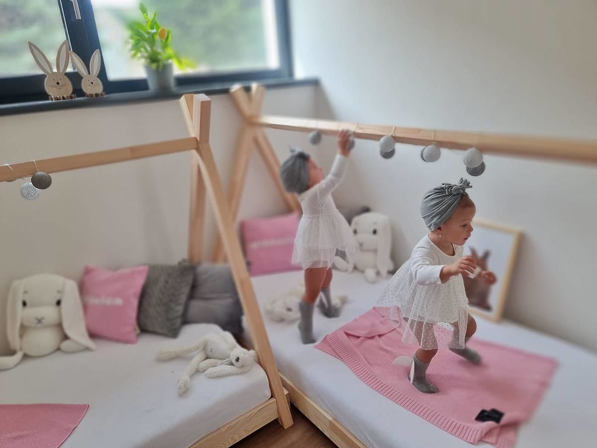 Nádherná postel ve tvaru domečku teepee, v jednoduchém skandinávském stylu do dětského pokoje.
