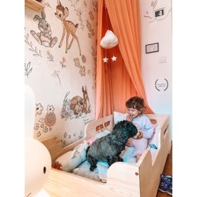Rošt postele je nízko nad zemí, a proto si malé děti do postele vlezou pohodlně bez pomoci rodičů. Bočnice postele je vykrojená tak, aby zároveň tvořila zábranu postele.