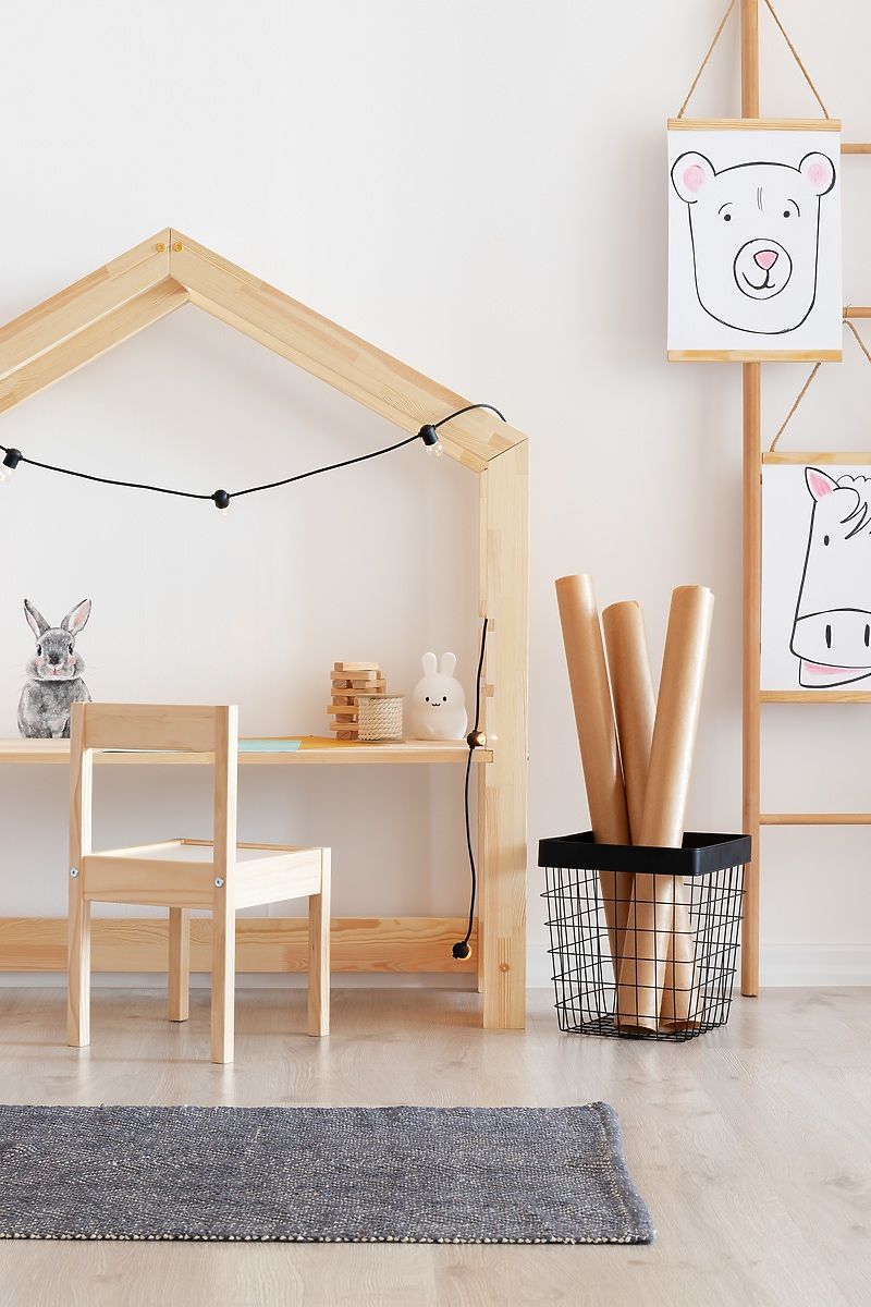 Psací stůl ve tvaru domečku s praktickou policí do dětského pokoje pro holku nebo pro kluka. Kvalitní a hladké zpracování spolu s masivní konstrukci zajistí dítěti bezpečí a pohodlí při učení a jiných aktivitách. Pracovní deska je výškově nastavitelná.
