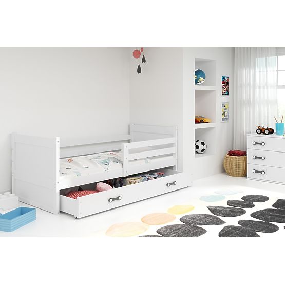 Jednoduchá bílá postel Rocky do dětského pokoje se šuplíkem a bezpečnostní zábranou. Vlastnosti:- zábrana je univerzální, při montáži si určíte, na kterou .. více