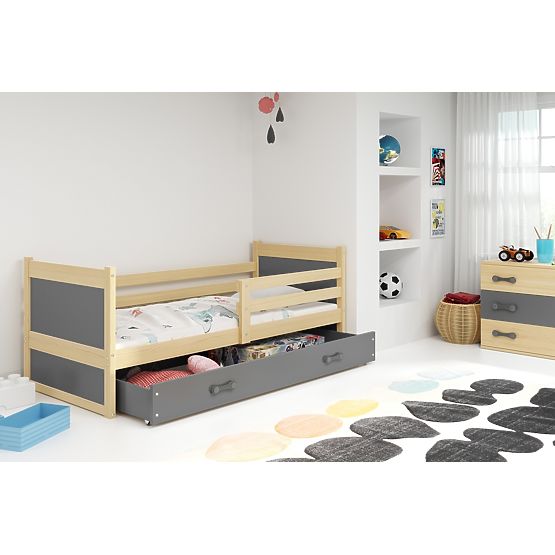 Jednoduchá postel Rocky v kombinaci přírodní a šedé barvy do dětského pokoje se šuplíkem a bezpečnostní zábranou. Vlastnosti:- zábrana je univerzální, při .. více