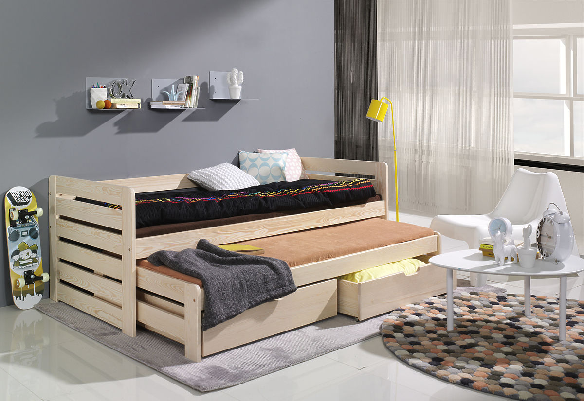 Postel obsahuje: 2x polyuretanové matrace s bavlněným potahem na zip, rošty, 2 kompletní šuplíky na kolečkách.