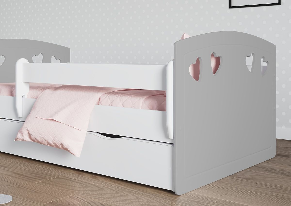 Krásná a moderní postel se zábranou v jemné barevné kombinaci bílé a světlo šedé barvy, zdobená vyřezávanými srdíčky, je díky těmto vlastnostem ideální do dětského pokoje pro holky.