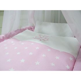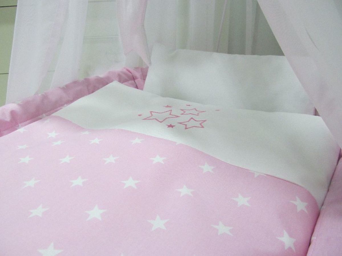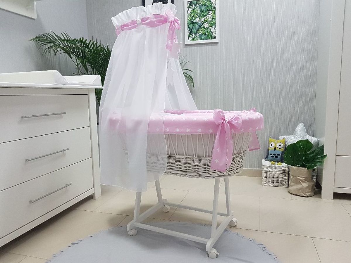 Babynabytek.cz » Dětský nábytek / Postýlky / Proutěné postýlky / Proutěná postýlka s výbavou pro miminko - růžové hvězdy