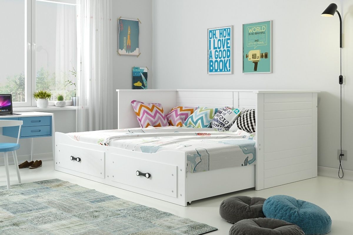 Rozkládací bílá postel HERMES se zvýšenou zádovou deskou je ideální volbou do dětského pokoje pro 2 děti. Díky rozměru matrace 200x80 cm získáte postel, která je vhodná pro děti až do dospělosti. Možná si ji dokonce oblíbíte vy sami.