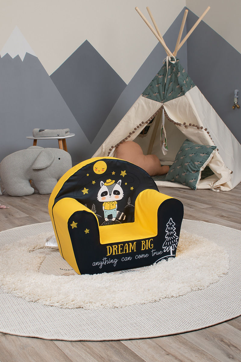 Černo-žluté křesílko s motivem roztomilého Mývala v nočním lese. Na křesílku je nápis DREAM BIG anything can come true. Dětské křesílko je vyrobeno z měkoučké a lehounké pěny. Díky tomu máte jistotu, že je bezpečné a praktické pro každodenní používání.