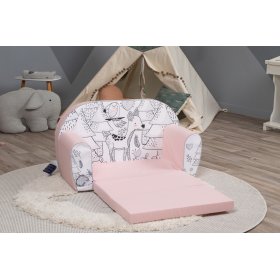 Barevná pohovka s motivem kolouška a lesních zvířátek. Kombinace růžové látky a černobílého potisku je vhodná do dívčího pokojíku. Dětská pohovka je vyrobena z měkoučké a lehounké pěny. Díky tomu máte jistotu, že je bezpečná a praktická pro každodenní používání.