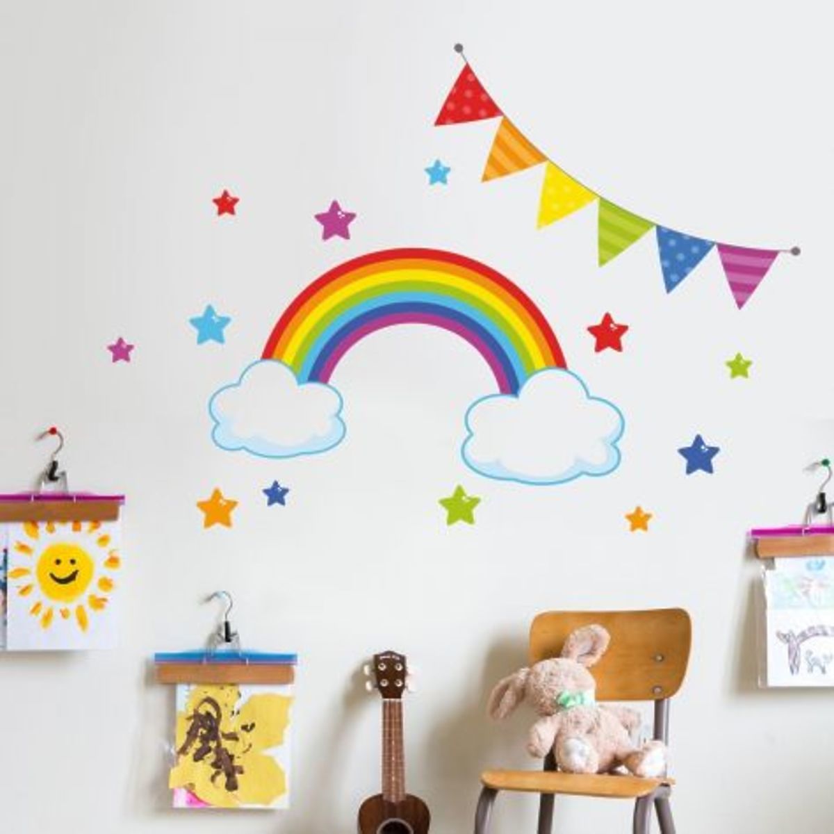 Krásná samolepka barevné duhy a hvězdiček rozzáří pokoj každého dítěte. Oživte dětský pokojíček roztomilou nástěnnou dekorací. Rozložení dílů na stěně máte ve svých rukou. Pokud si chcete užít zábavu zapojte do dekorování své děti.