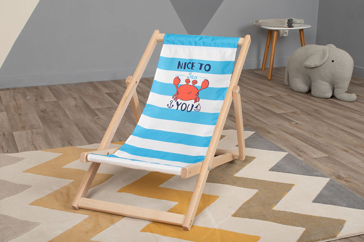 Krásné plážové lehátko se vzorem veselého krabíka na modro-bílé látce. Lehátko zdobí vtipný anglický nápis NICE TO Sea YOU. Dopřejte dětem pohodové odpočívání na slunečních paprscích. Dětské plážové lehátko je skvělá alternativa zahradní židličky či křesílka.