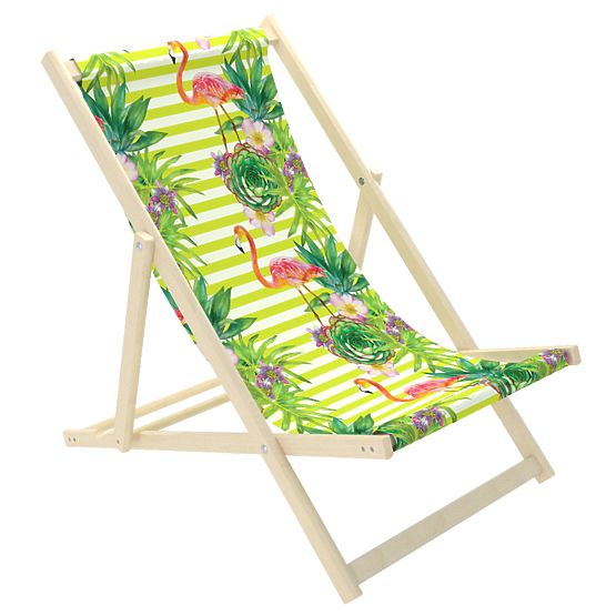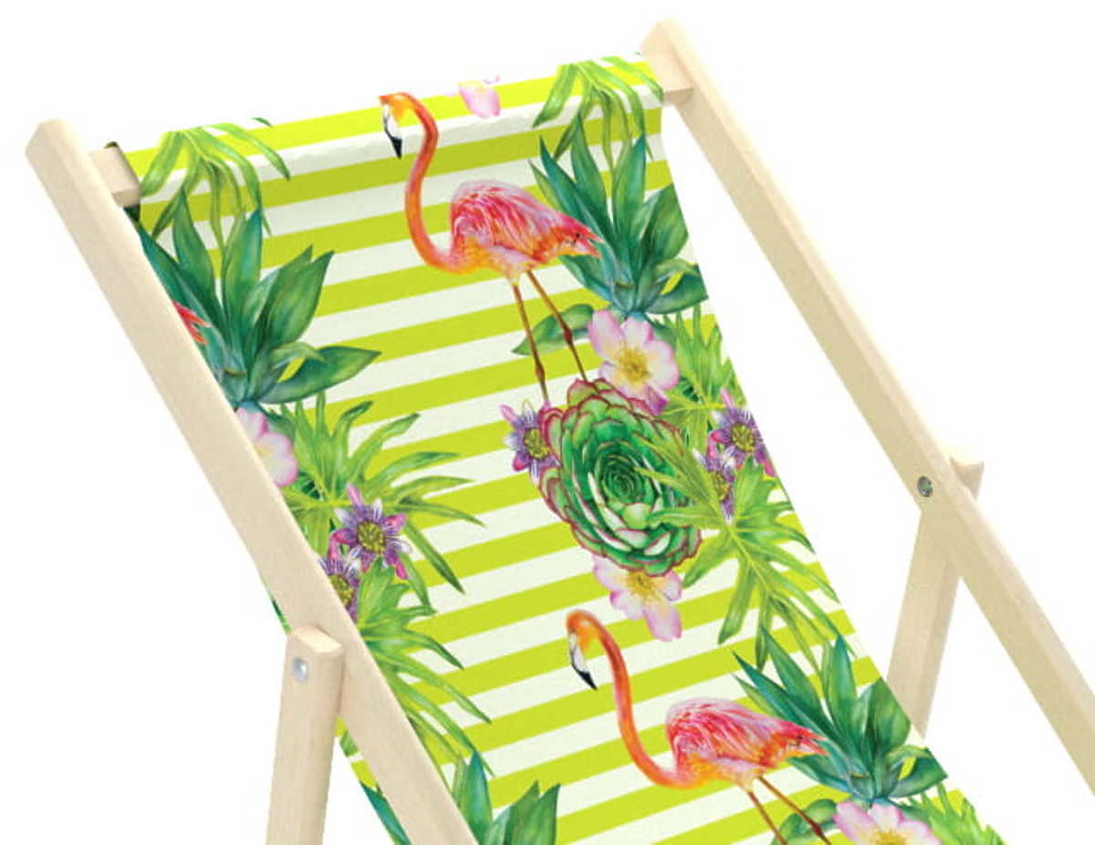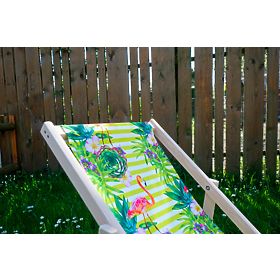 Krásné plážové lehátko se vzorem plameňáků a tropických květin. Látka má krásnou zelenou barvu s bílými pruhy. Dětské plážové lehátko je skvělá alternativa zahradní židličky či křesílka.