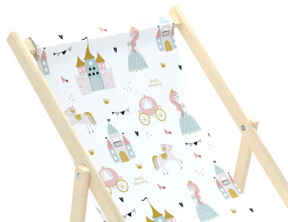 Krásné plážové lehátko s pohádkovým vzorem pohádkových princezen a zámků. Kromě princezen a zámků najdete na látce také královské kočáry, koně a drobný nápis little princess. Dětské plážové lehátko je skvělá alternativa zahradní židličky či křesílka.
