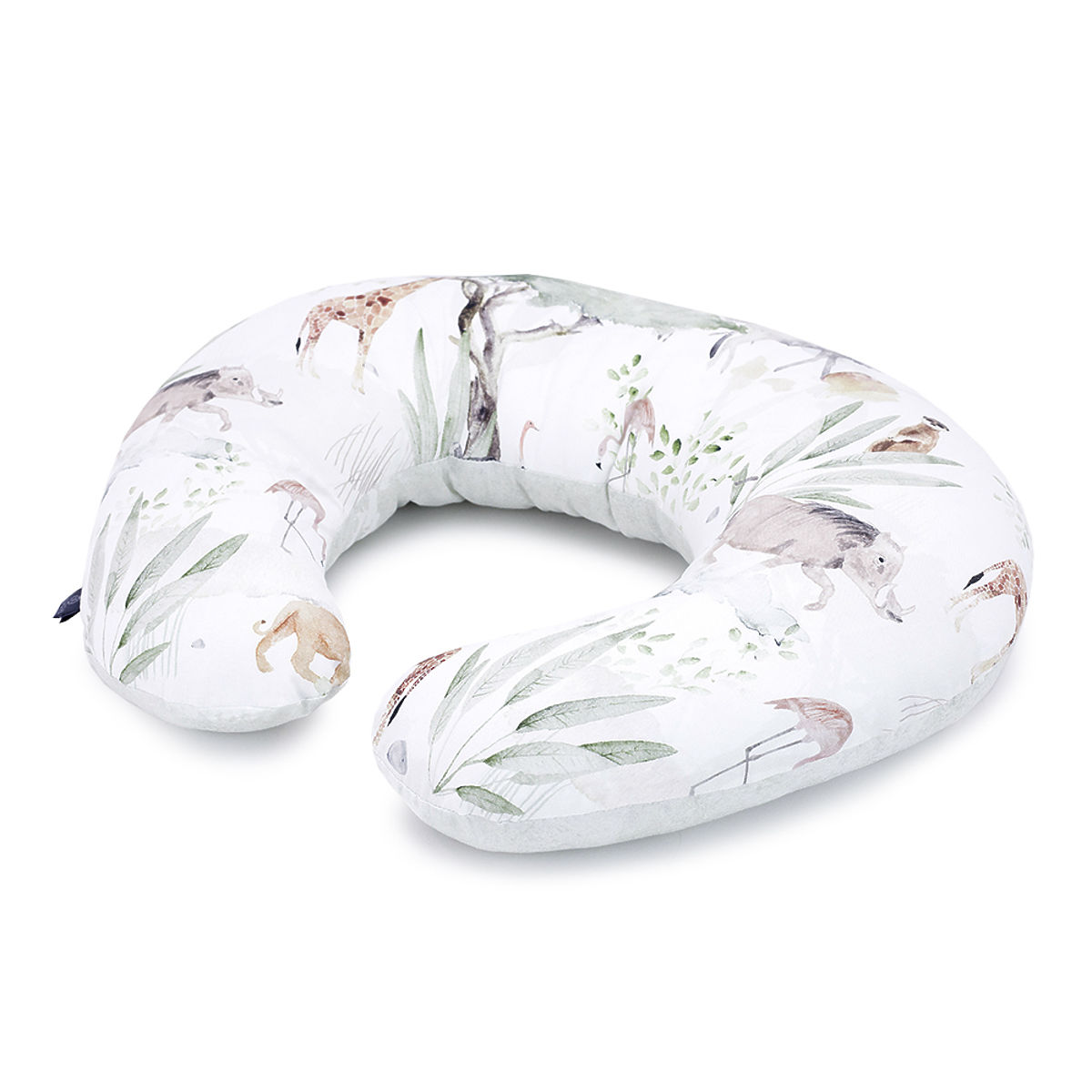 Měkoučký kojící polštář ve tvaru podkovy s motivem ručně malovaných zvířátek z africké savany. Polštář potěší maminku i dítě. Mamince uleví při kojení, aby si příliš nenamáhala ruce, záda a krk. Miminku dává kojící polštář zakusit pocit blízkosti a bezpečí.