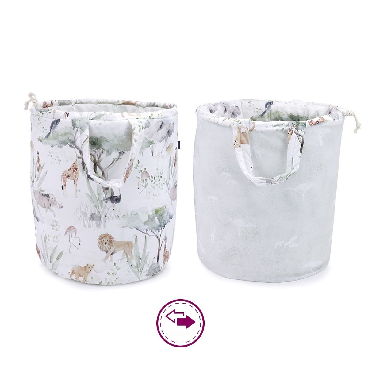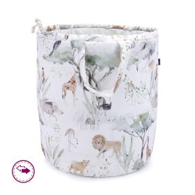 Koš na hračky s motivem ručně malovaných zvířátek z africké savany. Díky měkoučkému úložnému prostoru s krásným vzorem se naučí uklízet pokojíček i ty nejmenší děti. Bavlněný koš si zachovává své vlastnosti i barevný potisk navzdory opakovanému praní.