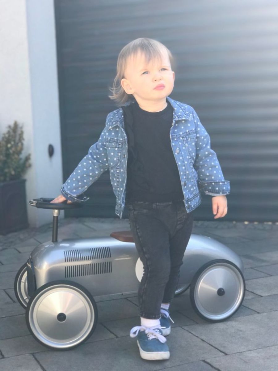 Autičko má pevnou kovovou konstrukci, volant, kterým lze otáčet a plastovou polstrovanou sedačku pro maximální pohodlí během jízdy. Vše je vyrobeno ve stříbrné barvě ve stylu 30-let. Hračka spolehlivě nabádá dítě k pohybu a rozvíjí jeho motorické dovednosti. Autíčko můžete vzít s sebou na procházku, ale díky pogumovaným kolům chránícím podlahu před poškrábáním je vhodné také do bytu.