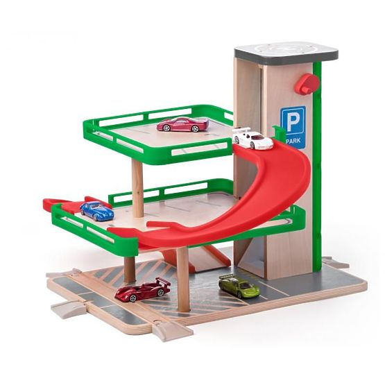 Dřevěné třípatrové parkoviště bude perfektním dárkem pro každého malého závodníka. V sadě je také pět originálních vozidel od značky SIKU.