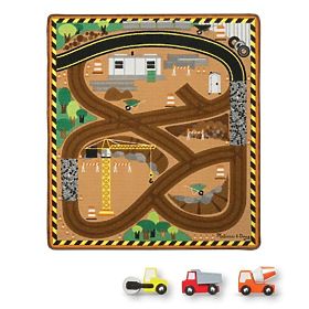 Podložka je s motivem stavební plochy. Najdete tady jeřáb, kolečka, vykopané jámy, zábrany, zátarasy, kužele a mnoho dalšího. Součástí sady jsou také tři dřevěné stavební stroje, díky kterým bude zábava ještě zajímavější.
