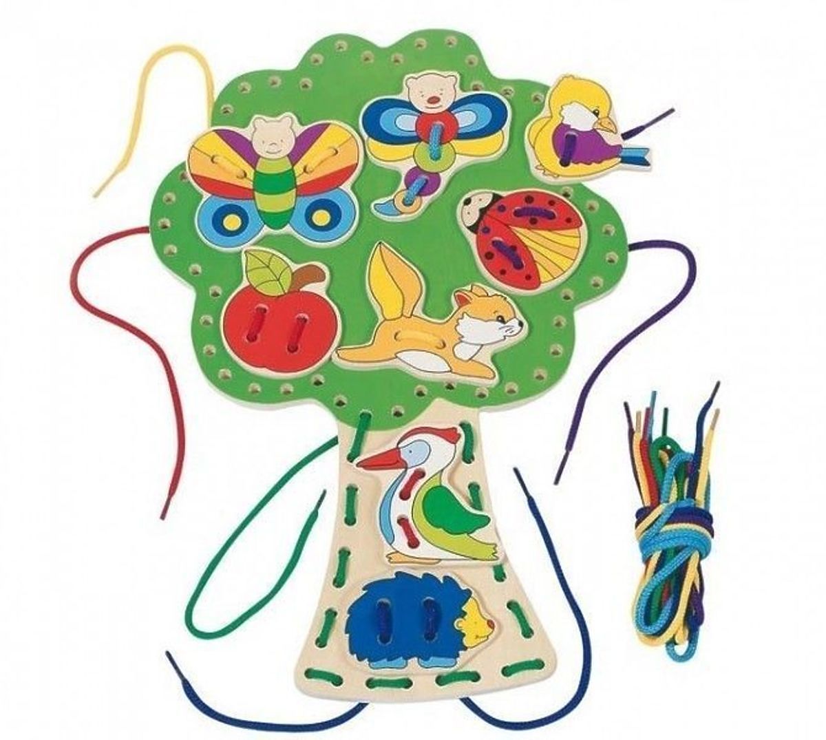 Barevný strom s proplétacími tkaničkami bude skvělou hračkou k procvičování jemné motoriky dětských rukou.