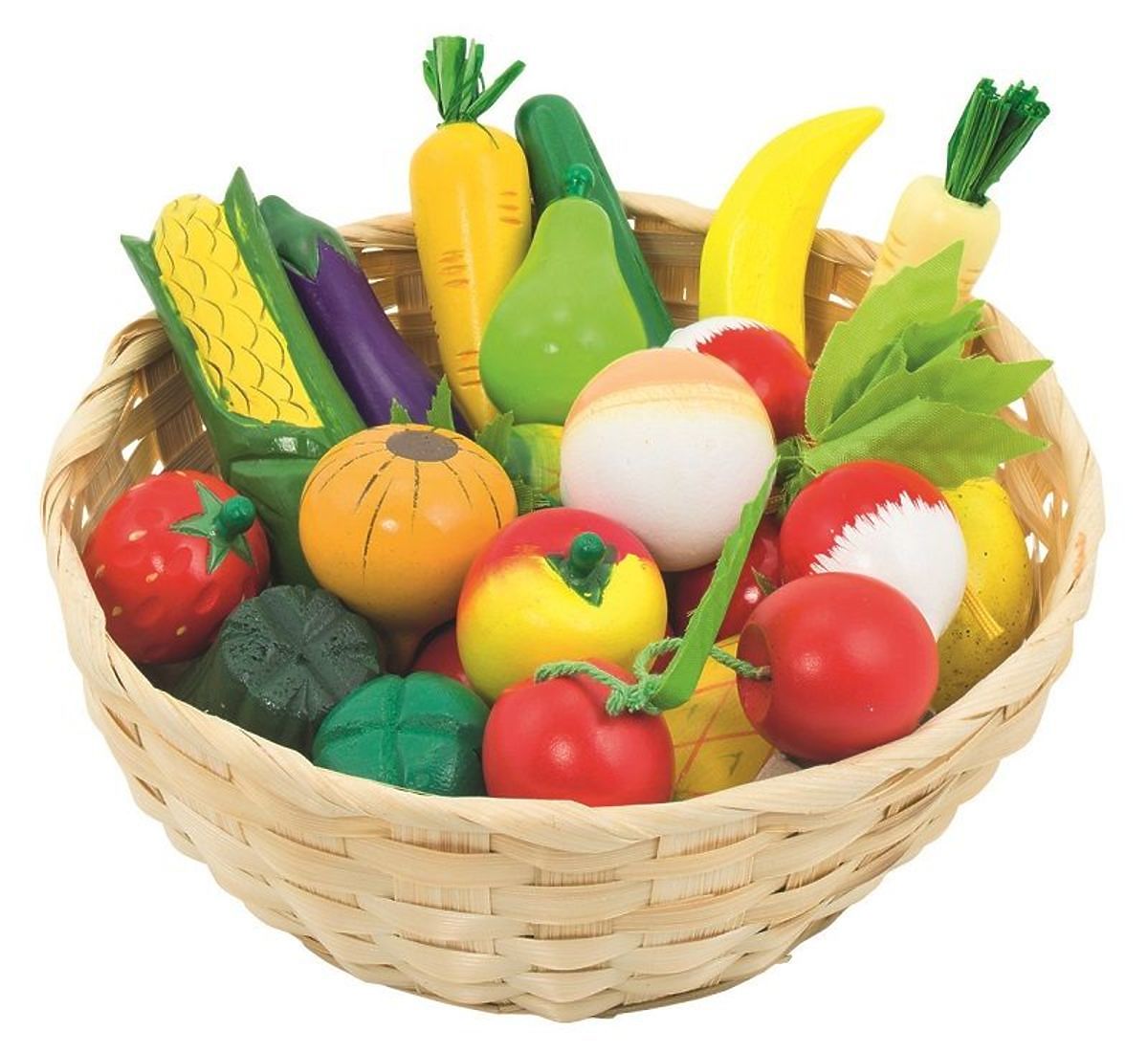 V košíku najdete 21 kusů zeleniny a ovoce vyrobených ze dřeva, které zajistí jejich trvanlivost a možnost opakovaného používání. Některé kusy zeleniny mají listy z textilního materiálu, díky nimž ještě více připomínají skutečné potraviny. Sada obsahuje například: ananas, jablko, banán, papriku, ředkvičku, rajče, okurku, kukuřici, mrkev, petržel.