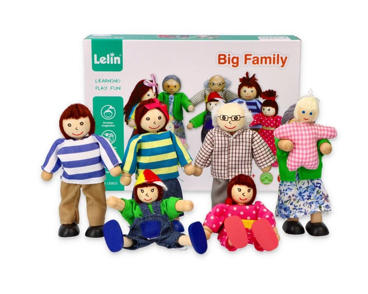 Veselá dřevěná rodinka bude skvělým doplňkem do domečku pro panenky a k sadám malého nábytku z naší nabídky. V sadě najdete rodiče, prarodiče a tři děti.