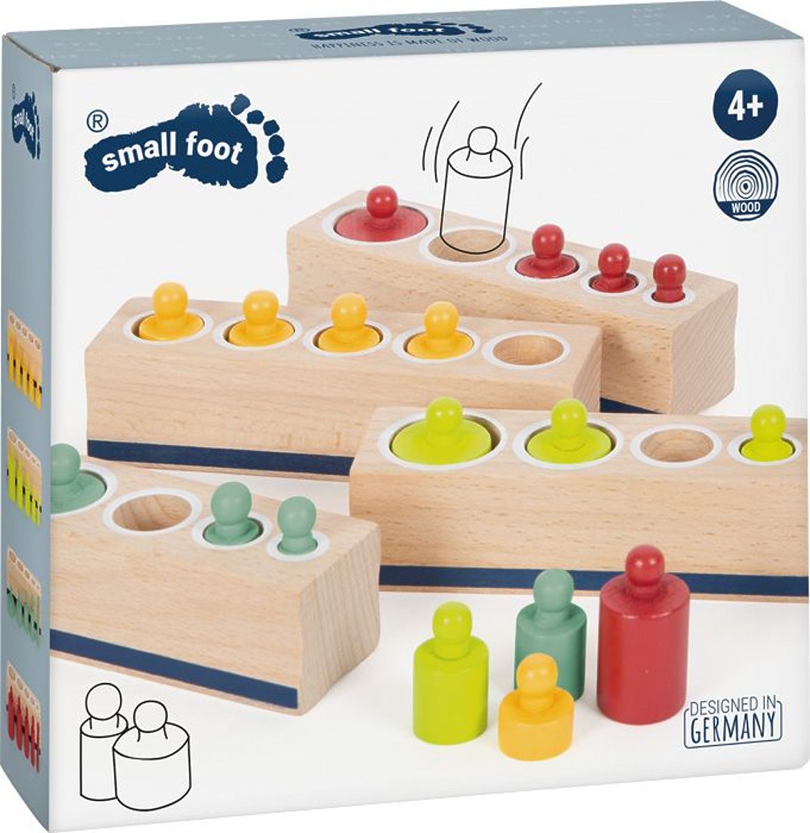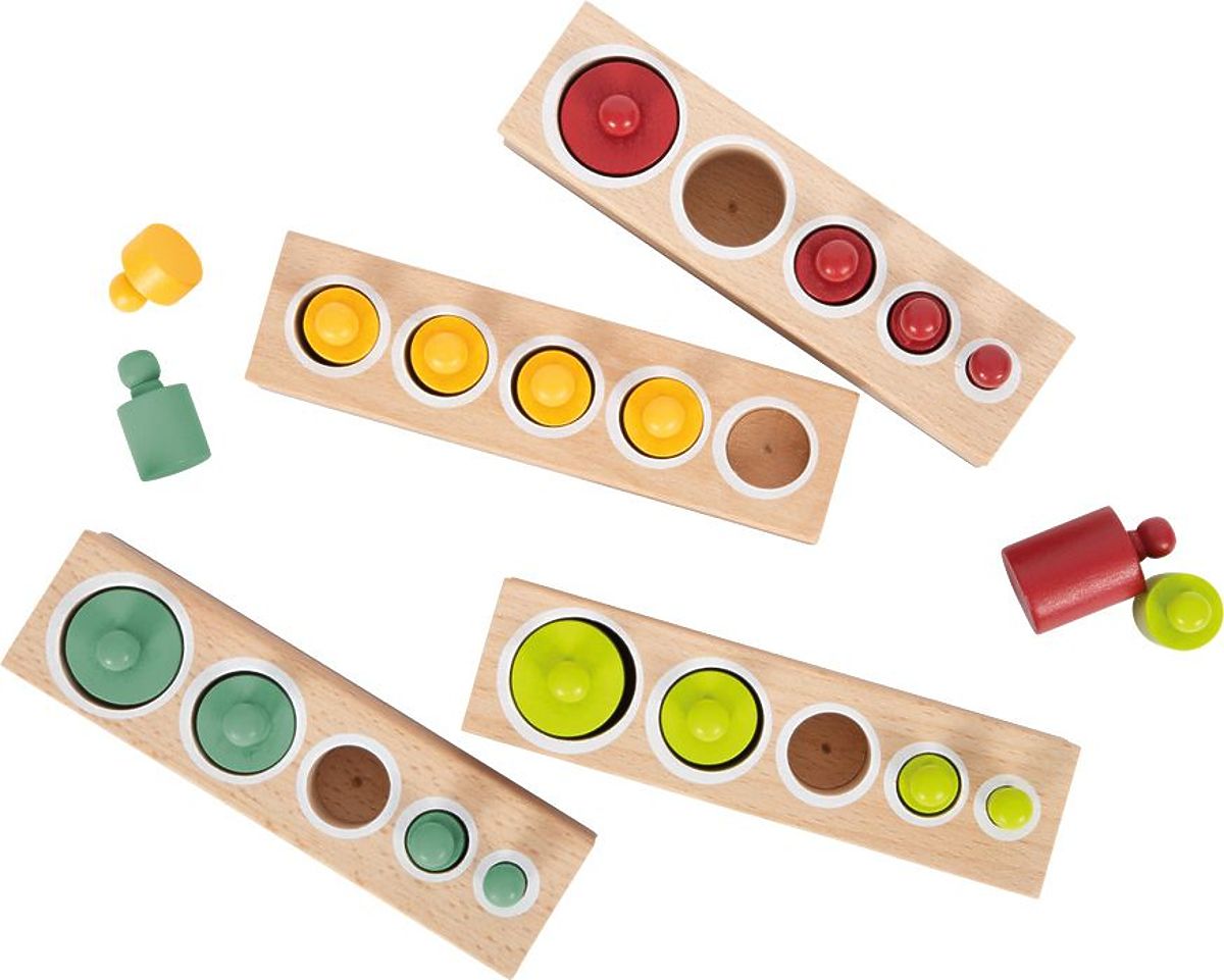 Barevná vkládací závaží budou skvěle fungovat jako klasická vkládačka, pomůcka při počítání nebo při poznávání tvarů a barev. Součástí balení jsou čtyři dřevěné prvky s kulatými otvory a dřevěná závaží ve čtyřech barvách - červené, zelené, modré a žluté. Závaží se liší nejen barvou. Dítě prostřednictvím hry odhaluje rozdíly mezi různými tvary a jejich hmotností.