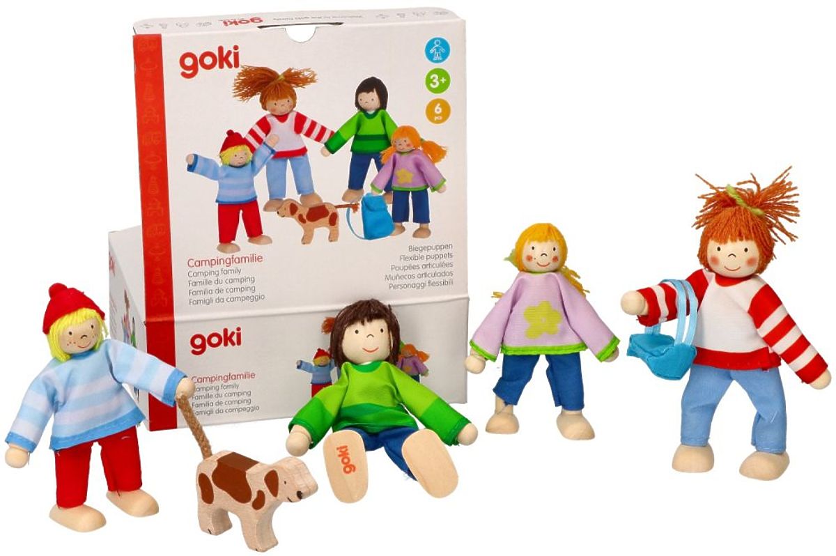 Veselá dřevěná rodinka bude skvělým doplňkem do domečku pro panenky. V sadě najdete rodiče, dvě děti a pejska. Panenky rády cestují, takže mají s sebou také odnímatelný batoh.