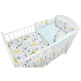 Set povlečení s motivem stylového město vhodný do postýlky o rozměru 140x70 cm. Povlečení je stylové a vhodné do postýlky pro chlapečka.
