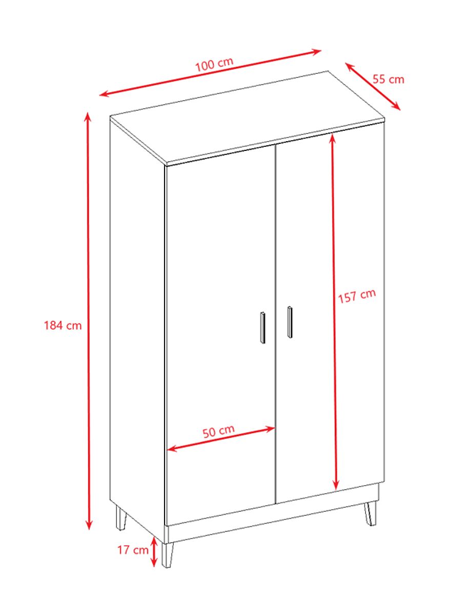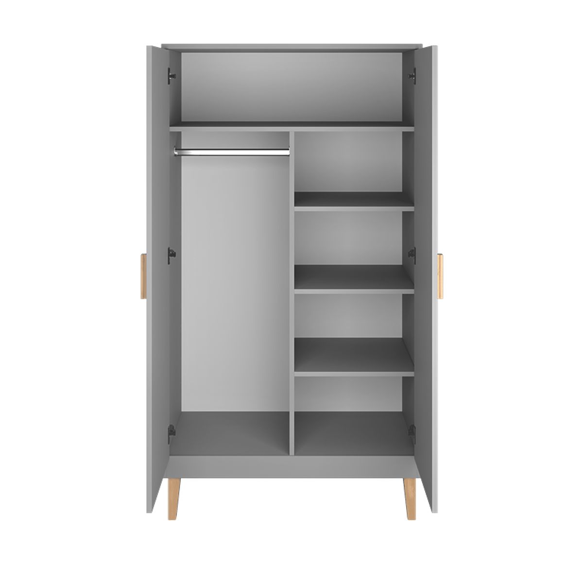 Dvoudvéřová šatní skříň obsahuje 5 prostorných polic, které jsou uspořádány tak, aby zbylo místo i na šatní tyč pro zavěšení ramínek s oblečením. Ergonomické úchytky jsou stylové a spolu se systémem tichého dovírání zlepšují váš pocit z každodenního používání této skříně.