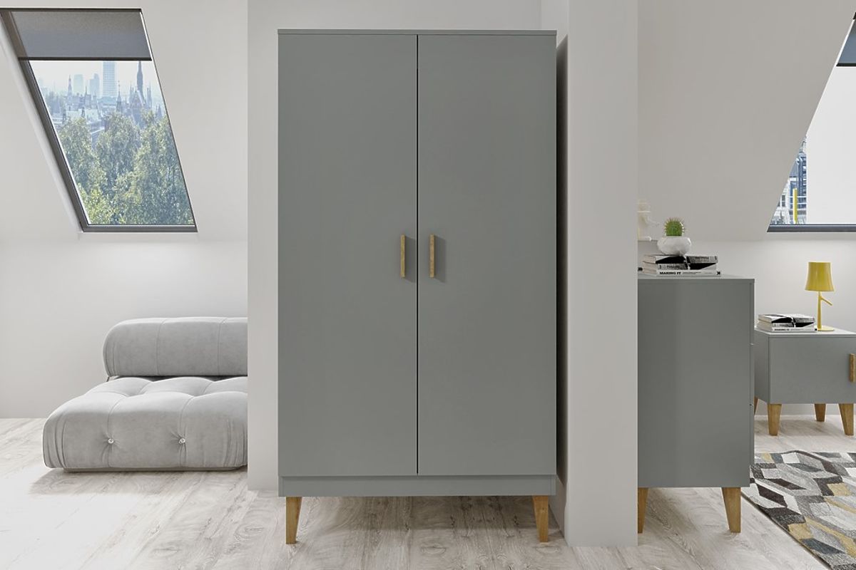 Moderní šedá šatní skříň KUBI na dřevěných nožkách z dubového masivu. Svým designem skříň ladí do dětských pokojů zařízených ve skandinávském stylu. Je vhodná do pokojíčků dětí v každém věku, pro kluky i holky.