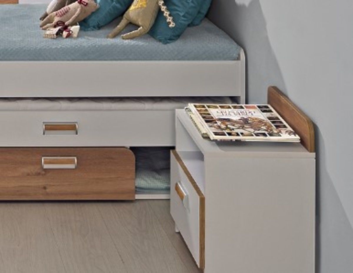 Praktický noční stolek L12 v elegantním designu je vhodný do dívčího i chlapeckého pokoje. Stolek je univerzální také díky barevné kombinaci čistě bílé a dubu nash.