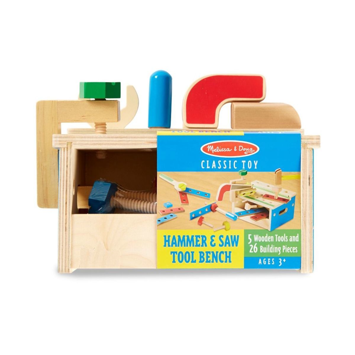 Tesařská dílna je zároveň pracovním stolem s otvory, do kterých můžete zatloukat hřebíky nebo k ním přišroubovat dřevěné prvky a vytvářet tak nejrůznější zajímavé konstrukce.