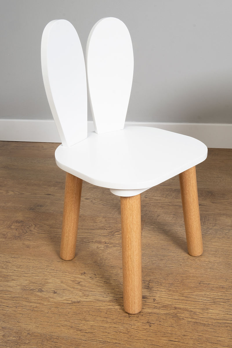 Dětský stoleček a 2 židličky v kombinaci bílé a přírodního dřeva. Pokojíčky pro kluky i holčičky oživí originální set nábytku. Ušaté židličky připomínají králíčky a působí roztomile.
