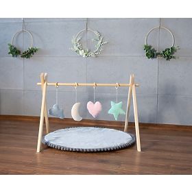 dřevěná hrazda hrací podložka - světle šedá 4 hračky - hvězda, srdce, měsíc a mrak montážní materiálMateriál: