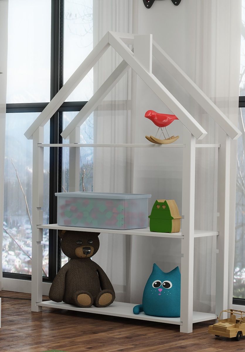 Bílý policový regál FRANK ve tvaru domečku je stylovým a praktickým doplňkem do dětského pokoje. Potěší holky i kluky. Tři police v různých výškách dětem poskytnou dostatek prostoru pro organizaci jejich osobních věcí. Od hraček přes školní učebnice až po všelijaké drobnosti.