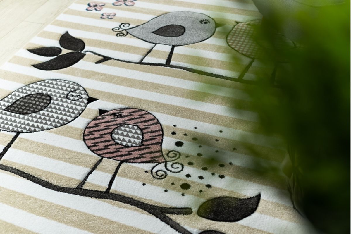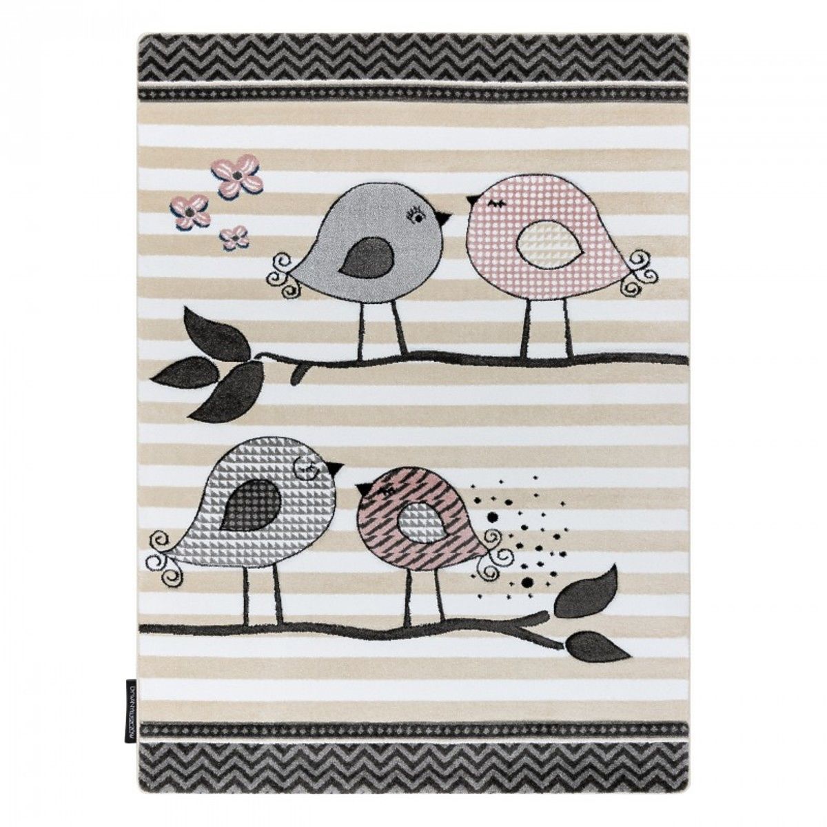 Pruhovaný, béžovo-bílý koberec, z kolekce Petit, s motivem roztomilých ptáčků krásně doplní každý dívčí pokojíček. Koberec je měkoučký, příjemný na dotek a díky nízkému vlasu snadný na údržbu.